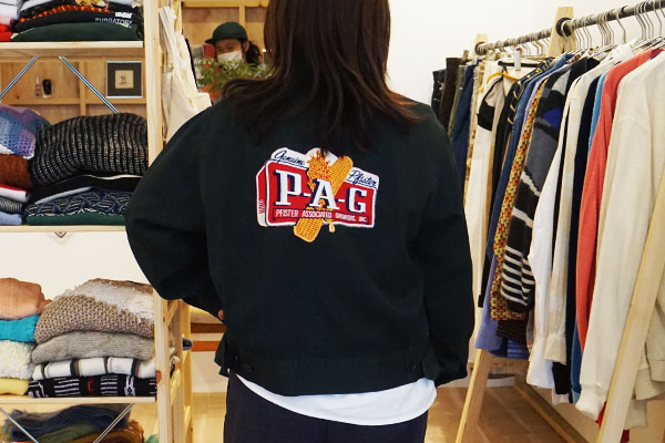 ことみせスタッフが試着したのは、アメリカのコーン工場で着られていたというワークジャケット(13,800円)。カッコイイ!
