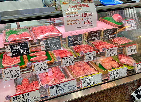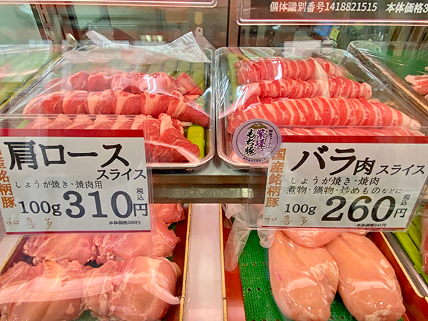 While the pork loin slices are superior for frying or cutlets, the boneless pork rib is tops for barbecuing (yakiniku style), stir fries, hot pots and the ever popular pork and ginger. At 260 yen per 100g it’s also very reasonable. The pork shoulder on the left is also recommended for pork and ginger, at 310 yen for 100g.