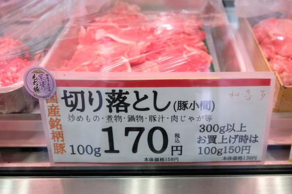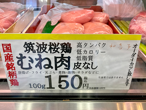 Another brand of chicken, this time the Tsukuba Sakura brand from Ibaraki Prefecture. Mr. Wakita trims the skin, fat and tendons off the breast meat before it goes into the showcase. “Many customers are senior folk who don’t need large amounts; it saves food loss at both sides and makes the meat more convenient to use. I’ll cut it to order too so customers can buy only what they need,” he explained.