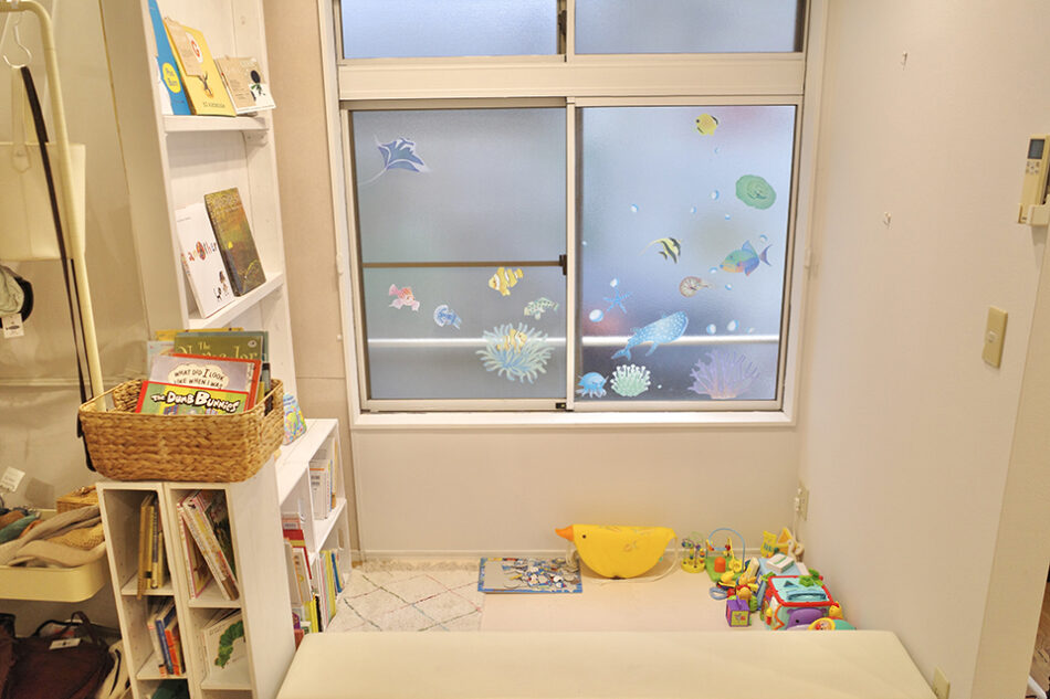 △キッズスペースに敷き詰められたクッションシートや、窓ガラスに広がる水族館のような空間作りに、一児のお母さんでもあるオーナーの気遣いを感じる
