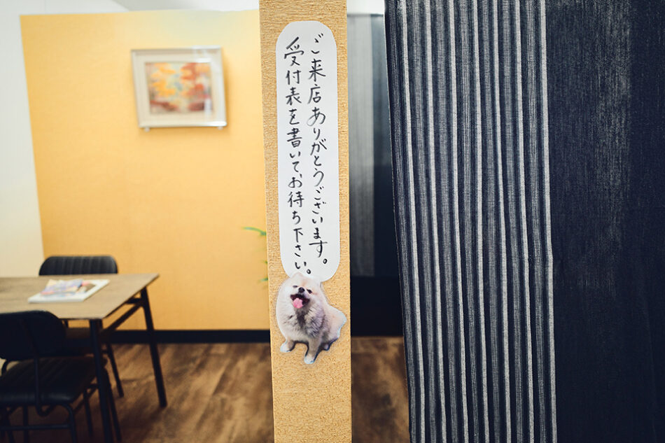 和の雰囲気に作り込まれた外観が特徴で、永代通りを歩くとすぐに見つけることができます。暖簾をくぐると、店長・齋藤さんの愛犬「カリアゲ君」の写真がお出迎え。