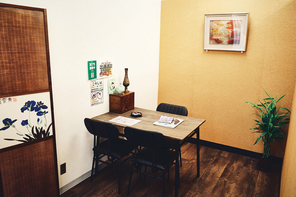 半個室の査定ブースとは別に待合スペースも。中には、本来お値段をつけるのが難しい買取品も「店舗に飾るために」と値段をつけて買い取った品物もあるそう。