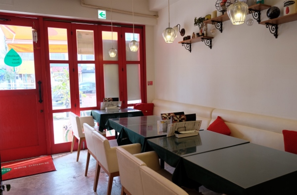 緑・白・赤のイタリア三色旗をモチーフにした明るい店内はお子さん連れもウエルカム。
