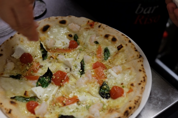 高温の窯に入れて焼きあがったピザに細かく砕いたピスタチオをトッピングして、人気のピザ、ピッツァリーゾが完成しました。