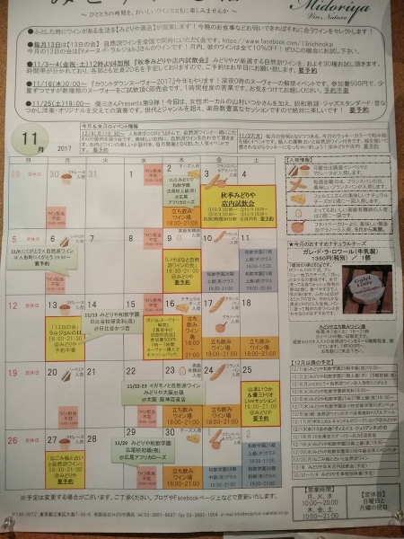 If you prefer to date around with your wines before committing to a whole bottle, Midoriya’s Wine Tasting Nights, held periodically on the weekends, are a dream come true. Mr. Maruyama opens around six bottles of wines with a colourful selection of flavours, which can be purchased by the glass for around 500~700 yen. Customers drink the wine casually while standing around the counter table set into the middle of the store. If you like what you taste, you can consider picking up a bottle on the way out.