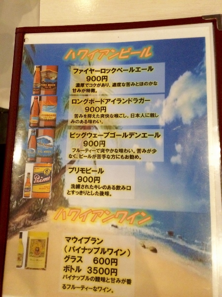 There are also several varieties of Hawaiian beer and half a dozen Japanese craft beers. There is an extensive cocktail menu of both standard and tropical mixed drinks. For those eschewing alcoholic beverages, there is a comprehensive selection of tropical juices, fruit teas and caffeine-free drinks.