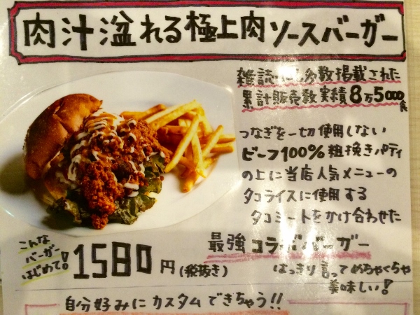 The burgers come with a variety of toppings including avocado, cheese, pineapple, pakuchi (coriander) and so on. This is a collaboration burger, topped with incredibly juicy taco rice meat.