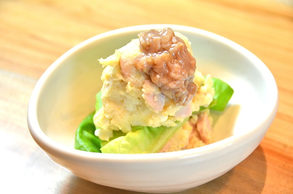 名物「酒盗のせ大人のソーセージ入りポテトサラダ」590円や