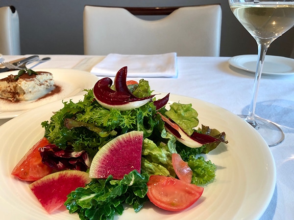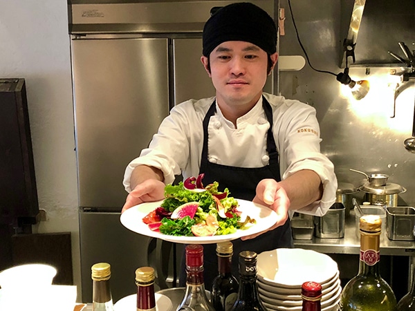 Many of the herbs and leaf vegetables used at Kokusho are sourced from the Uenohara Herb Garden in Yamanashi Prefecture. For 25 years the Herb Garden has been growing a variety of mustard greens, kale, endives, chard, wasabi, and the like, all without agricultural chemicals or pesticides of any kind. The vegetables are used by over 100 of the top restaurants in Japan, not to mention some of the finest hotels. The Osada salad, named after the Uenohara director Emiko Osada, features seasonal leaf vegetables such as kale, wasabi and radicchio Tardivo in a vinaigrette dressing.
