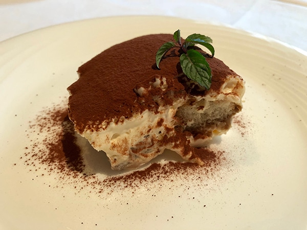 For those with room to spare, tiramisu, apple pie, or lemon granita. The tiramisu is made 50-50 with mascarpone and ricotta cheese. It’s wonderful; rich, creamy, and slightly bitter from the cacao powder.