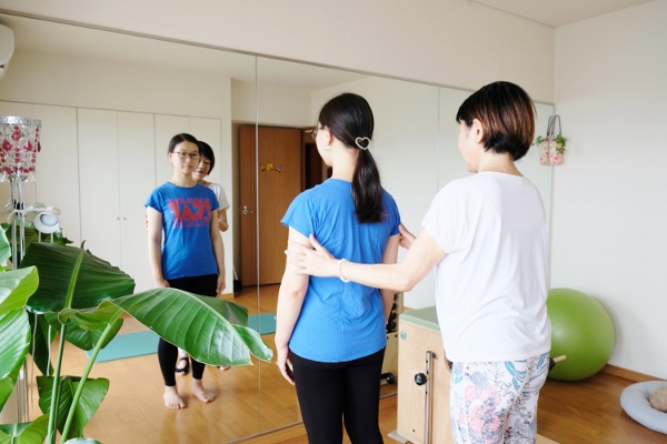 最初に体の状態を確認します。「こちらの肩が下がっていますね。頭の位置も前ぎみです。正しい状態にしていきましょう」ということで、マンツーマンのレッスン開始!
