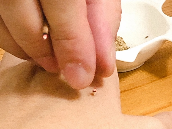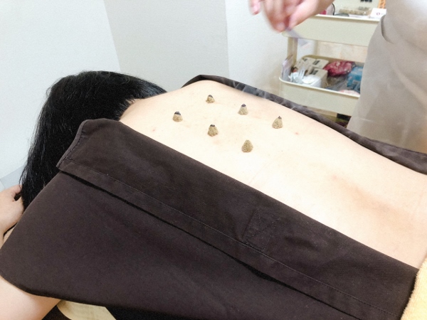 これは、日本伝統鍼灸にのっとった「知熱灸」というお灸だそうです。気血の流れを良くします。