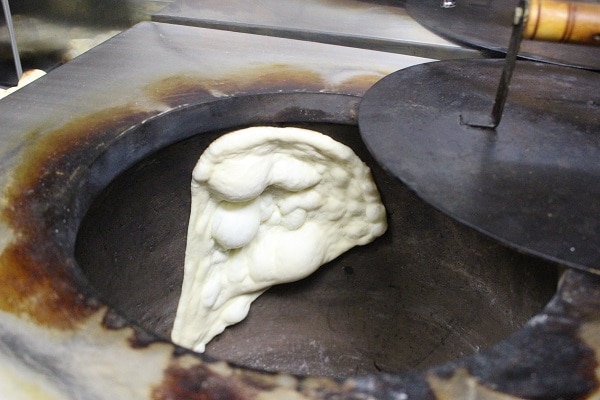 And stuck to the inside of the oven where it cooks for around a minute. The tandoor oven is heated to 400C and the naan immediately swells up, crisp on the outside, soft on the inside and nicely stretchy. The whole room fills with the rich, warm smell of baking bread, a fabulous aroma that cheers the spirits immensely.
