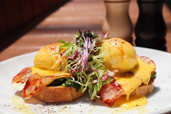 △自家製のパン・ド・カンパーニュを使った定番人気の「エッグベネディクト」1,200円。自家製オランデーズソースが絶品!
