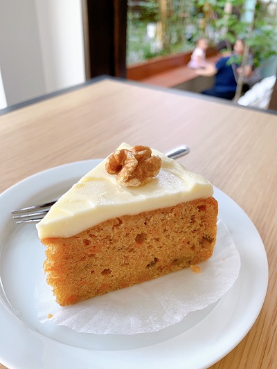 △すりおろしたニンジンとシナモン入りの「キャロットケーキ」480円。クリームチーズフロスティングとのコントラストも愉しいスイーツです