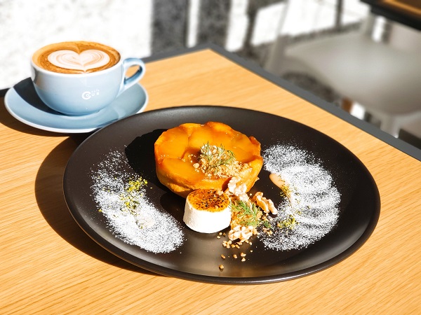 △1月末までの「りんごのタルトタタン 豆乳とラム酒のパルフェ添え」700円。ドリンクとのセットは1,100円