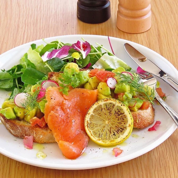 △自家製のパン・ド・カンパーニュの上にたっぷりのアボカドとサーモンをトッピングした「スマッシュアボ」1,300円
