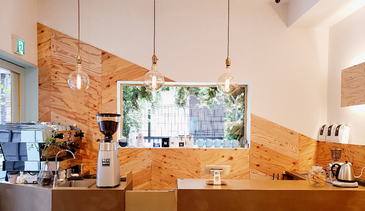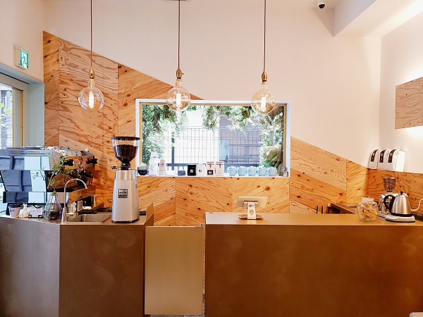 エスプレッソマシンが目を引くカウンター背面の窓にはグリーンがセンスよく配され、まるでアート作品のよう。