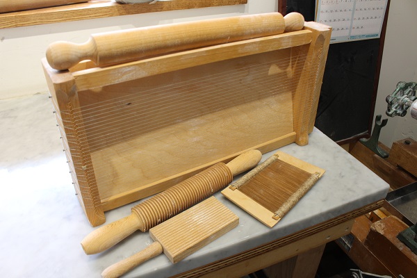 その横には大理石のパスタ打ち台、そしてイタリア各地で買い揃えたパスタ成型の道具たち。
