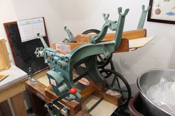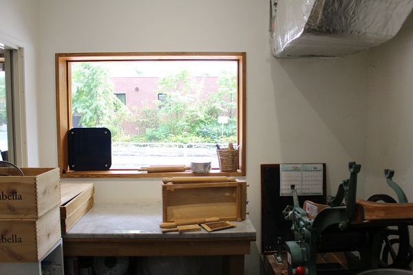 ガラス張りの製麺室には、友人の蕎麦職人から譲り受けたという製麺機が鎮座しています。