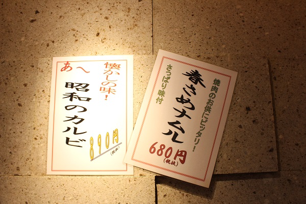 「昭和カルビ」(890円)は、近年ポピュラーな霜降り寄りのカルビではなく、赤身の上に脂身がのった昔懐かしいビジュアルと味。昭和世代の常連さんからの声で生まれた隠れ人気メニューです。