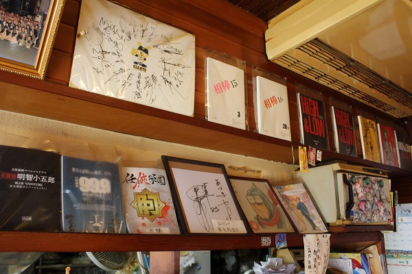 昭和風情漂う雰囲気に、壁に飾られた力士のサインや番付表、巨人のユニフォームに有名俳優のサインや写真、そしてよくよく見れば、名だたるテレビドラマの台本が!