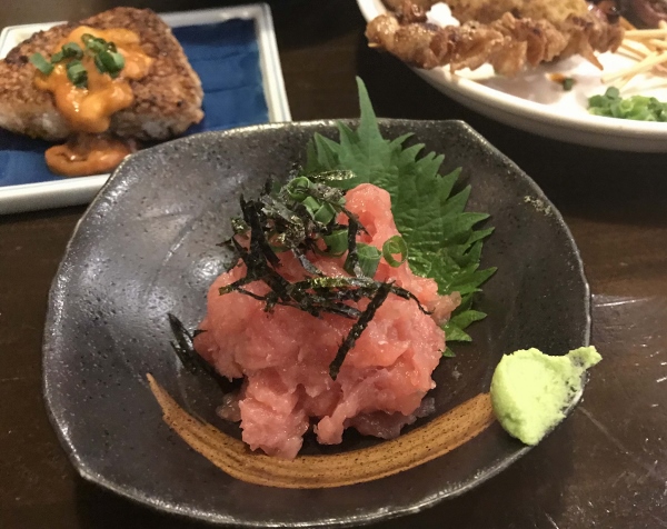 希少部位“まぐろの脳天”をいただく人気メニュー、「まぐろのなかおち」は580円。