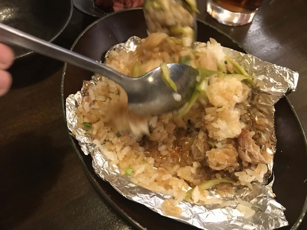 アスパラと豚バラ肉、ごはんの上にバターと醤油を乗せてホイルで包み、備長炭の高温で一気に焼き上げ。混ぜると炊き込みご飯のような香りがふわ〜っと漂います。