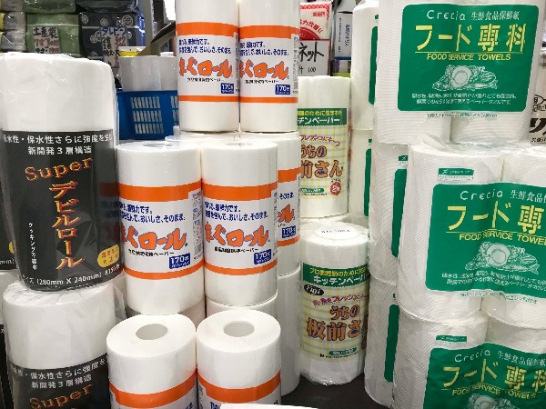 飲食店の厨房機器メーカーが運営する三輝の主力商品は、厨房に常備する包装資材や雑貨類。例えば、キッチンペーパーだけでもプロ仕様のものが店頭に常時10 種類以上そろいます。