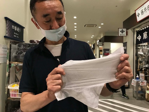 「ご家庭で魚を調理するときに便利なのは、不織布製のSuperデビルロールです。水分の吸収力に優れている上に破れにくいんです」、と塚田さんが実演してくれました。