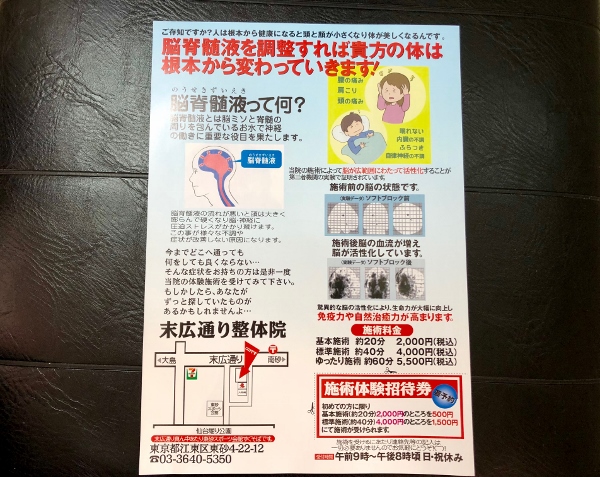 Mr. Kobayashi charges extremely reasonable prices for his services: a basic 20-minute session is 2,000 yen, 40 minutes is 4,000 yen, and 60 minutes is 5,500 yen including tax. Customers can use National Health Insurance (kokumin kenko hoken). Trial sessions are available too: just 500 yen for a 20-minute trial or 1,500 yen for a 40-minute session. “This style of chiropractic is designed to increase vitality, prevent hardening of the muscles and improve the autonomic nervous system together with the spinal nerve cells,” he says.