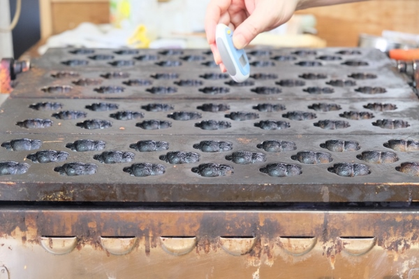 According to Mr. Kobayashi, some hardcore ningyo-yaki fans loved the crispy overspill so much that they asked him to make a biscuit version. He spreads the batter on the spaces between the molds in a figure eight pattern, then closes the molds for a few seconds.