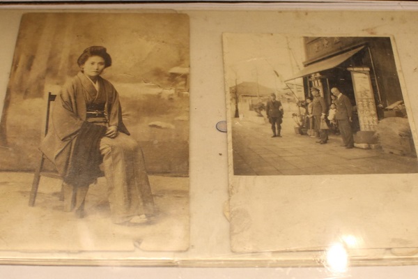 △実はこちら、女将のひいおばあ様(左)とひいおじい様(右写真右)、おじい様(右写真中央)。戦時中、おじい様に召集令状が出て、出征する時の様子だそう。戦前は中屋食堂だった場所であり、冒頭の、女将が映る店頭の写真と同じ場所!