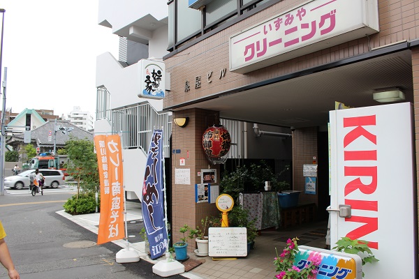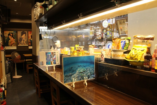深川一丁目交差点に面した店の前には立ち飲みスペースが並び、その背後のブルーのボックスには、よ~く見るとなんとウミガメのはく製が。
