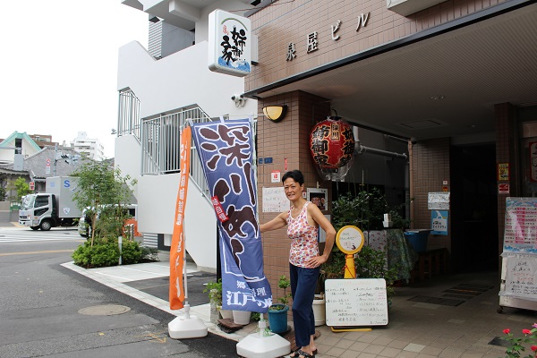 △深川で生まれ育った江戸っ子四代目の女将、常泉光枝さん。前身「姉御家」からの名物「深川めし」は、戦前同じ場所で「中屋食堂」を営んでいたひいおばあ様から受け継ぐ秘伝の味