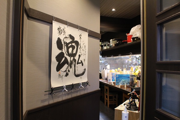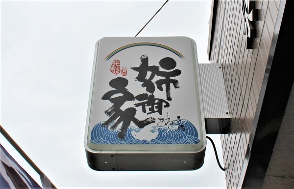△「魂込めました!」というお気に入りの看板は、女将が愛する浮世絵と、幸運の印である虹がモチーフ