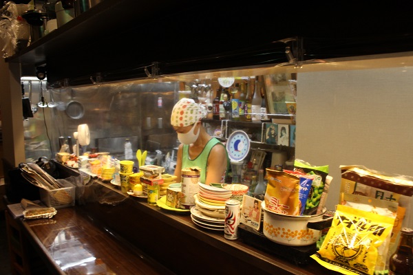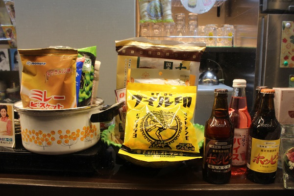 さらに進むとカウンター席。昭和のホーロー鍋やカラフルな異国の器に昔懐かしい駄菓子・・・、そして正面には昭和レトロなポスターがズラリ。