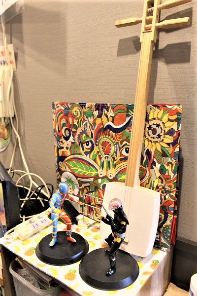 その向かいには大ファンだという志穂美悦子さんに関連するフィギュアと、ミニ三味線・小じゃみチントン。女将は三味線の弾き手でもあるのです。