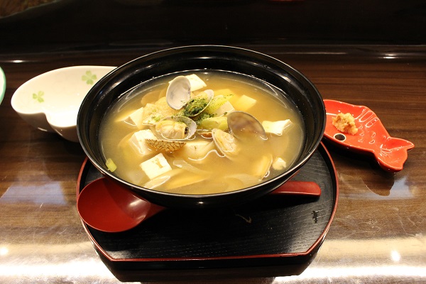 雑穀玄米ご飯にあさり汁をたっぷりかけた「ぶっかけ深川めし」は、20年前からの名物を雑穀玄米でよりヘルシーに。プリプリのあさりに豆腐、キノコ、長ネギなど、素材の旨みが溶け出した味噌汁は、ひいおばあ様から受け継いだ秘伝のレシピ。高知の生姜を添えてどうぞ。