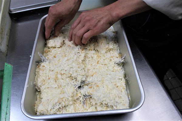 △さっくりとした仕上がりになるよう、粗挽きの生パン粉をふんわりとまとわせます