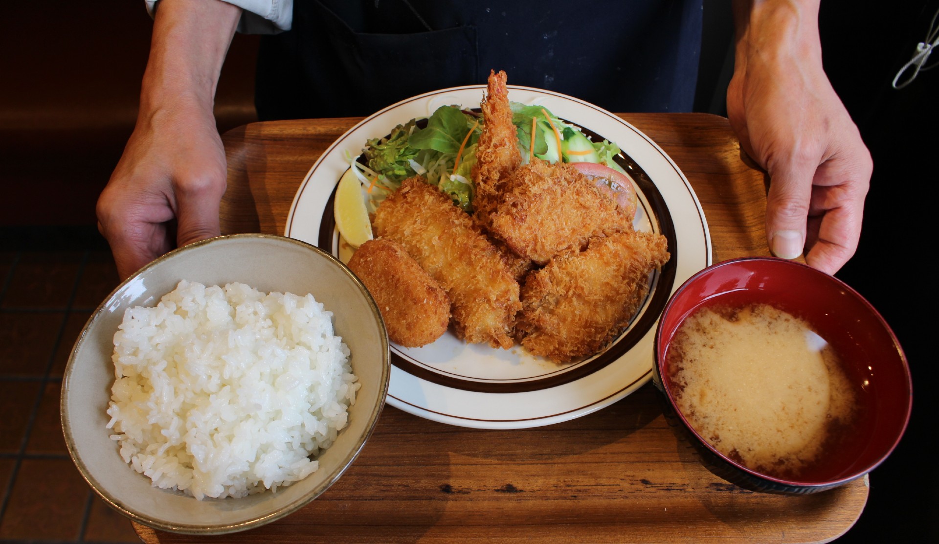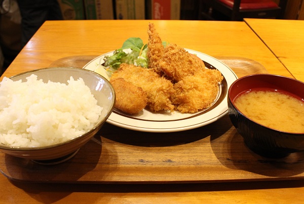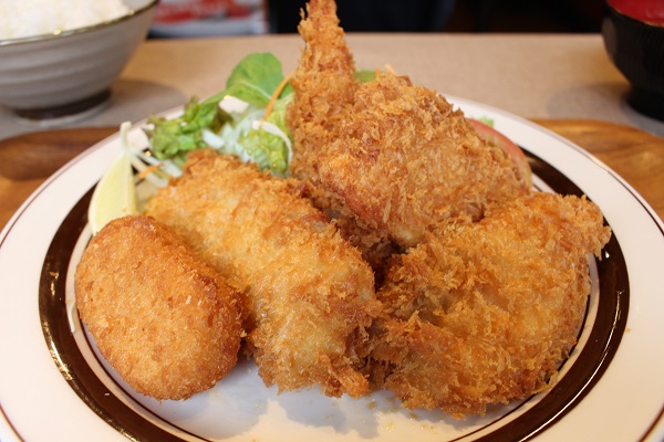 こちらがその「シーフードミックスフライ」960円。大ぶりのエビにクリームコロッケ、サーモン2切れ、イカと、5種類の揚げたて熱々のフライ。信頼の業者から仕入れたり、晴久さんが自ら吟味した厳選食材を使用。冬にはサーモン一切れがカキフライに変わります。