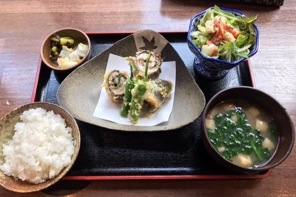 “I go to Tsukiji in the morning and have a good look at all the fish available,” says Mrs. Kubo. “Then I make a selection based on what’s best and plan the specific dishes from there.” This particular day was sardines rolled with pickled plum (ume) and shiso (perilla leaves), then deep-fried. Served with a salad, pickles, rice, and miso soup it makes a healthy, nutritious lunch for just 1,000 yen.