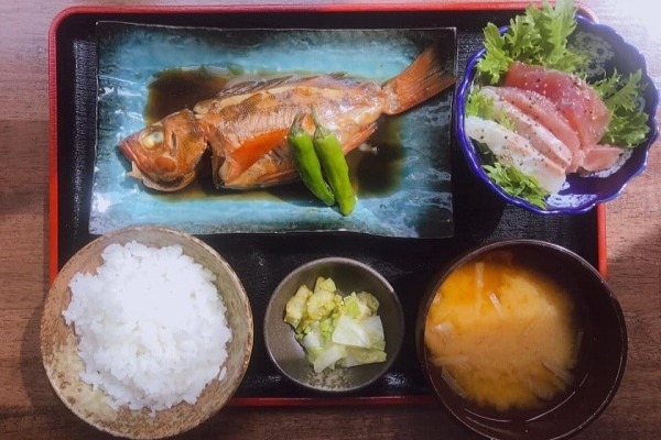 This Tsukiji lunch set features a gently simmered fish together with sashimi, pickles, soup, and rice. Mrs. Kubo’s 30-year career as a cookery instructor shines through in these dishes!