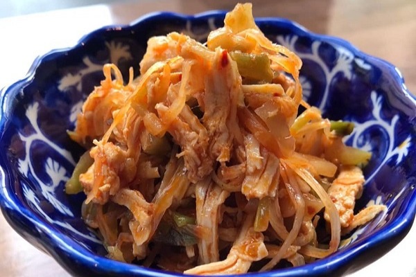 The daily menu at Kibakubo is bursting with tasty treats, such as this spicy chicken with pickled mustard plant stem (zasai) and finely sliced white negi onion. At only 460 yen, it goes nicely with white rice and a glass of sake.