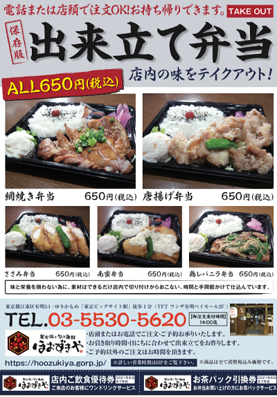 また、ランチメニューをテイクアウトで楽しめる「手作り弁当」各650円も人気。「唐揚げ弁当」「網焼き弁当」など5種類がラインナップしています。