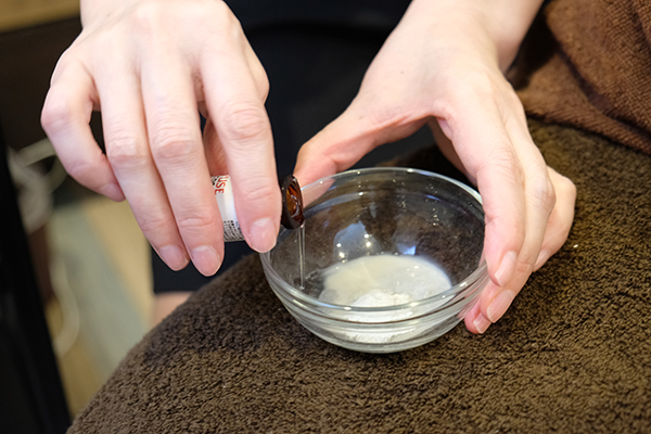 体に安全なケイ素の鍼成分「スポンジア」を、肌質改善に有望なプラセンタ、抗酸化作用が高いアスタキサンチン、ヒト幹細胞培養液、アミノ酸などを含んだ美容液に混ぜ、顔全体に塗布します。