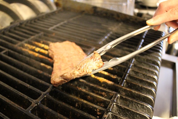 カウンター席から見渡せるオープンキッチンで華麗な焼き技を見せてくれるのは、マネージャーの阿部千恵子さんと女性スタッフ。「お肉の持ち味を引き出すよう、専用のグリルで余分な脂を落としながら焼き上げ、旨みを閉じ込めます。外はしっかり焦げ目をつけ、中はしっとりジューシーに仕上げています」と阿部さん。