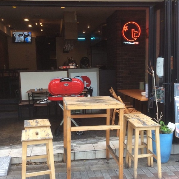 木場駅から徒歩3分の永代通り沿いに建つ、ガラス張りの外観が目を引くおしゃれなバルです。