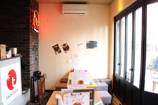 カウンター前のテーブル席も間隔をゆったりとり、新型コロナ感染拡大防止対策を行っています。