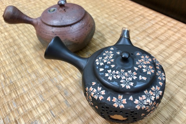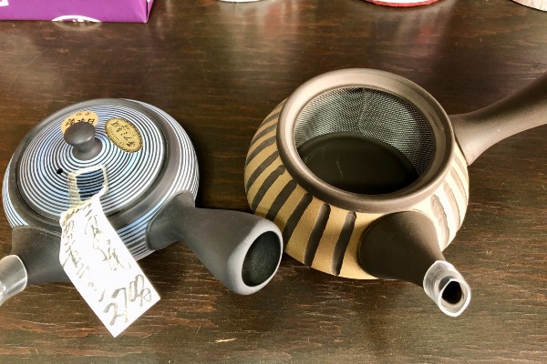 Modern teapots often have a mesh net fitted inside the pot itself, like the one on the left. “Tea has changed over the years and the pots have adapted too,” explained Ms. Hori. “Nowadays the leaves are steamed for longer than in the past. This makes the resulting tea stronger but also more powdery. These internal mesh nets are finer and trap more of the tea leaves.”